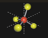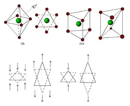 A grande maioria dos compostos hexacoordenados apresenta geometria octaédrica. O arranjo octaedrico é bastante simétrico, sendo o ponto de partida para entender outros arranjos deste grupo, que são distorçoes do octaedro, em função do fator de empacotamento, ou seja, uma compressão ou alongamento ao longo dos eixos de ordem dois, três ou quatro, como mostrado a seguir. Estas distorções podem ser tetragonais (mais simples), de forma que os ligantes sobre o eixo diferem dos outros quatro, para mais ou para menos, ou pode haver distorções rômbicas, nas quais um ligante trans está mais próximo do átomo central enquanto o outro está mais afastando. Estas distorções geram uma família imensa de isômeros geométricos que variam do octaedro ao prisma trigonal (D3h).[2]