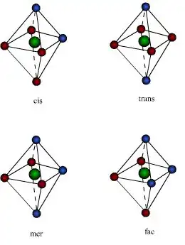 Os compostos octaedricos permitem uma variedade de estereoisômeros. A partir do fato que os seis vértices de um octaedro são equivalentes, apenas uma estrutura é possível para complexos dos tipos MA6 e MA5B. Já para o MA4B2 podem existir isômeros cis e trans. No isômero cis os dois ligantes B ocupam os vértices adjacentes do octaedro; no isômero trans estão em vértices opostos, como mostra a figura.Para os complexos do tipo MA3B3, também são possíveis dois isômeros, denominados: facial (fac) e meridional (mer):