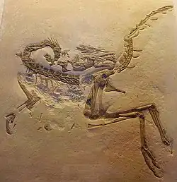 Do Compsognathus se conhecem dois esqueletos quase completos, um da Alemanha, que tem 89 centímetros de comprimento (35 polegadas), e outro da França, de 125 centímetros (49 polegadas).[18] Por quase um século, o Compsognathus foi o único terópode pequeno bem conhecido. Isto o levou a comparações com o Archaeopteryx e sugestões de uma relação com as aves. Inclusive Compsognathus e Archaeopteryx despertaram interesse no biólogo britânico Thomas Henry Huxley na origem das aves.[19] Os dois animais compartilham muitas semelhanças em forma, tamanho e proporções; na verdade, um fóssil sem penas preservadas de Archaeopteryx foi por muitos anos identificado erroneamente como um espécime de Compsognathus.[3] Muitos outros dinossauros, incluindo Deinonychus, Oviraptor e Segnosaurus, são agora conhecidos como parentes próximos das aves.[20]