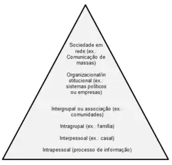 As formas de comunicação também podem ser analisadas a partir de uma distribuição piramidal, classificadas de acordo com os diferentes níveis de organização social nos quais a comunicação ocorre.[22][23]