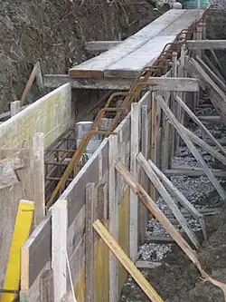 Chamadas em Portugal cofragens, são executadas em tábuas de madeira ou chapas de madeira compensada reforçada com sarrafos de madeira, ou, mais recentemente com chapas metálicas, as formas recebem primeiro a armadura e então o concreto. É importante um bom escoramento para evitar movimentação antes do concreto obter resistência.