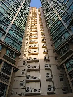 Unidades condensadoras exteriores na fachada de edifício em Hong Kong.