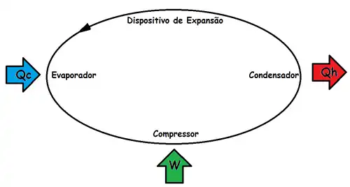 onde "Qh" e "Qc" são, respectivamente,os calores liberados e retirados dos reservatórios quente e frio; e W é o trabalho realizado/fornecido.