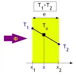 O calor transferido é tratado pela lei de Fourier que descreve especificamente previsões (modelagens) de comportamento para o caso simples de um corpo sólido, com duas paredes paralelas:[15][16]