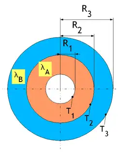 Condução através de cilindros pode ser calculada quando conhece-se variáveis tais como o raio interno , o raio externo , e o comprimento notado como .