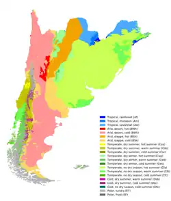 O centro-norte da região (Uruguai, sul do Brasil e parte da Argentina) tem clima subtropical. O norte do Chile tem o deserto do Atacama, um dos mais secos da terra. A Patagônia Oriental tem um clima semiárido frio.