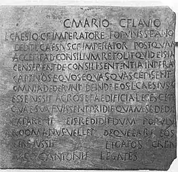 Bronze de Alcântara, inscrição latina declarando a rendição incondicional ("deditio") ante os romanos do povo que habitava um castro entre o território dos Lusitanos e dos Vetões, 104 a.C., Cáceres