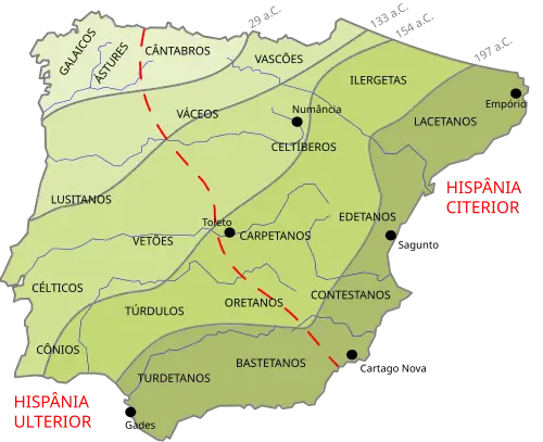 Mapa da conquista romana da Hispânia, desde o início da Segunda Guerra Púnica (219 a. C.) até às Guerras Cantábricas (29 a.C.). Apresenta os avanços territoriais com a localização dos principais povos pré-romanos a divisão original das províncias da Hispânia Citerior e Hispânia Ulterior.