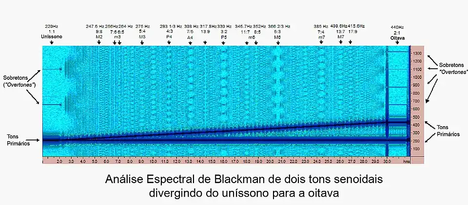 A base física para a observação de Pitágoras pode ser constatada na análise espectral acima e no arquivo sonoro acompanhante. Nos pontos em que as razões das frequências dos tons envolvidos são números simples (indicados pelas setas no topo do gráfico), os sobretons são mais ordenados e mais simples. A maioria dos ouvintes percebeque o tom do intervalo, nestes pontos são mais "puros" ou "harmoniosos".