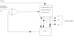 Seus circuitos são mais complexos do que os do conversor em rampa, porém seu tempo de conversão é muito menor, o que torna seu uso bastante atrativo. Além disso, os conversores A/D por aproximações sucessivas têm um tempo de conversão fixo, que não depende do sinal analógico presente em sua entrada. O esquema básico deste conversor é similar ao do conversor em rampa.