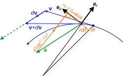 O termo é referido às vezes como o termo centrífugo e o termo como o termo de Coriolis.[18] Embora estas equações carreguem alguma semelhança em forma dos efeitos centrífugos e de Coriolis encontrados em referenciais rotativos, essas não são as mesmas coisas.[19] Por exemplo, as forças físicas centrífuga e de Coriolis aparecem somente em referenciais não inerciais. Em contraste, esses termos, que aparecem quando a aceleração é expressa em coordenadas polares, são consequências matemáticas da diferenciação; estes termos aparecem onde quer que coordenadas polares sejam usadas. Em particular, estes termos aparecem mesmo quando coordenadas polares são usadas em referenciais inerciais, onde as forças físicas centrífuga e de Coriolis nunca aparecem.