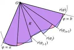 Este resultado pode ser achado como segue. Primeiro, o intervalo é dividido em subintervalos, onde é um positivo inteiro arbitrário. Portanto, (o comprimento de cada subintervalo) é igual a (o tamanho total do intervalo) divido por (o número de subintervalos). Para cada subintervalo , deixe ser o ponto médio do subintervalo, e construa um setor com o centro no polo, de raio e ângulo central e comprimento de arco . A área de cada setor construído é igual a