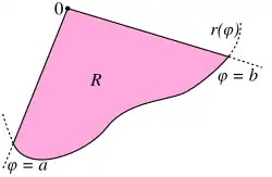 Aqui, é a mesma região descrita acima, isto é, a região limitada pela curva e os raios e . A fórmula para a área de R mencionada acima é recuperada ao tomar identicamente a 1. Uma aplicação mais surpreendente desse resultado resulta na Integral Gaussiana