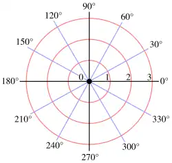 Ângulos em notação polar são geralmente expressos tanto em graus quanto em radianos ( sendo igual a ). Graus são tradicionalmente usados em navegação, agrimensura e muitas outras disciplinas aplicadas, enquanto radianos são mais comuns em matemática e física matemática.[9]