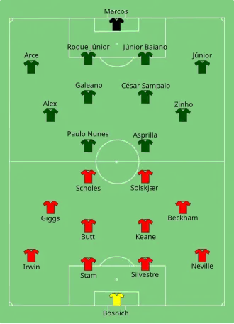 O gol de Roy Keane, aos 35 minutos, veio depois de uma grande jogada de Ryan Giggs pelo lado esquerdo. O galês chegou à linha de fundo, cruzou alto, Marcos saiu mal do gol, pulou para desviar a bola mas não a alcançou, e o meio-campista irlandês chegou para tocar de pé direito para o fundo da rede e marcar.