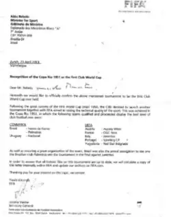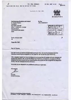 Fax do então secretário-geral da FIFA, Urs Linsi ao então presidente da CBF, Ricardo Teixeira, reconhecendo em 2007 a Copa Rio de 1951 como a primeira copa do mundo de clubes.