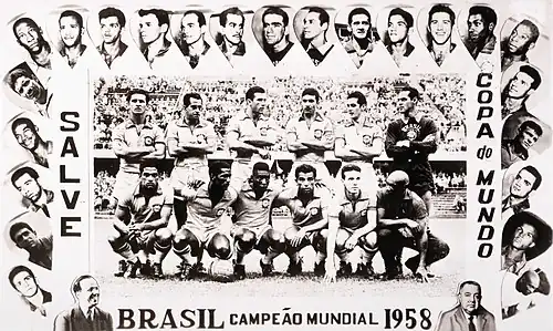A final seria disputada no Estádio Råsunda entre Brasil e Suécia em frente a um público de 50 000 pessoas. O Brasil perde o sorteio e joga de azul, pois ambos os times tinham o uniforme nº 1 em amarelo. "Nós vamos vencer, vamos jogar com a cor do manto de Nossa Senhora Aparecida" disse o dirigente da delegação brasileira Paulo Machado de Carvalho. Nem o gol sueco que inaugurou o placar aos quatro minutos de jogo abalou a equipe. Didi, o príncipe etíope, certamente uma das peças mais importantes do time brasileiro, pegou a bola e foi calmamente andando com ela debaixo dos braços, lembrando a todos que o Botafogo, base daquela seleção, tinha dado uma goleada na Suécia, de forma que não ia ser a seleção brasileira que ia perder deles. Resultado: Vavá marca gol logo aos nove minutos e vira o jogo ainda no primeiro tempo numa partida excepcional que, mesmo com a derrota por 5 a 2 em casa, a torcida anfitriã aplaudiu o time do Brasil de pé, ao saudar como campeões do mundo Pelé, Vavá, Garrincha, Zito, Mazzola, Nilton Santos, Didi, Gilmar, Zagallo, entre outros. Assim o Brasil sagrava-se pela primeira vez campeão mundial de futebol.