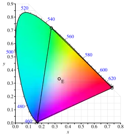 O espaço de cores CIE 1931 define cores primárias monocromáticas com comprimentos de onda de 435,8 nm (violeta), 546,1 nm (verde) e 700 nm (vermelho). Os cantos do triângulo de cores estão, portanto, no locus espectral, e o triângulo é quase tão grande quanto pode ser. Nenhum dispositivo RGB usa estas cores primárias, já que os comprimentos de onda extremos usados para o violeta e o vermelho resultarão em uma eficiência luminosa muito baixa.