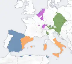 Reconhecido como soberano em Catalunha e Valencia em 1705, Aragão e Maiorca en 1706, Nápoles em 1707 e Sardenha em 1708.