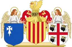 Brasão de armas do Reino de Aragão e de seus outros Reinos com anjos como suportes: à esquerda o Brasão das Armas antigas do Reino de Aragão, ao centro o Brasão do Conde de Barcelona, e à direita a Cruz de Alcoraz, Brasão heráldico do Reino de Aragão