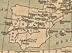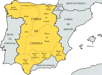 A Coroa de Castela existiu na Península Ibérica como uma entidade política separada na Idade Média e Moderna. Formou-se em 1230 a partir da terceira e definitiva união das coroas dos reinos de Castela e de Leão, e consequente ascensão de Fernando III de Castela ao trono leonês. Apesar da união pessoal das coroas de Castela e Aragão em 1469, pelo casamento dos Reis Católicos, a Coroa de Castela continuou a existir como uma entidade separada.[1] Com os Decretos do Novo Plano, após a Guerra da Sucessão Espanhola e a ascensão ao trono na Monarquia Católica da Casa de Bourbon, na pessoa do rei Filipe V, no início do século XVIII,[2]a separação de reinos foi abolida.[3]Assim, se inicia a assimilação por parte da Coroa de Castela dos restantes territórios, fundando a atual e unificada Espanha.[4][5]
