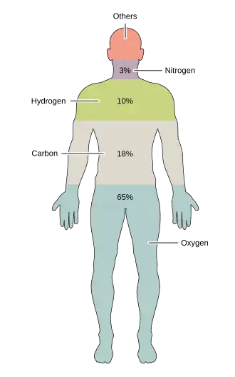 Quatro elementos são responsáveis pela constituição da maioria do peso de um humano, são eles: o carbono, nitrogênio, oxigênio e hidrogênio.[5] O hidrogênio (9,5% da massa corporal)[14] mantém a estrutura hidratada, além de estar presente em 90% da composição de todos os elementos e, é encontrado nos carboidratos, proteínas, amidos e lipídios que são necessários à dieta humana. Está presente no trifosfato de adenosina (ATP),[16] que é a principal molécula transportadora de energia.[17] O oxigênio (responsável por 65% da massa corporal)[5] é importante para as células visto que necessitam do oxigênio para funcionarem, elas usam a substância principalmente para a produção de energia vinda dos alimentos.[18] É transportado dos pulmões para os microrganismos através do sangue, sendo necessário ao metabolismo,[19] é responsável por inúmeras reações bioquímicas intracelulares.[20] Percentualmente a maior parte do elemento químico no corpo está na água que é uma das moléculas mais importantes para à vida.[6]