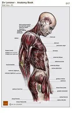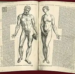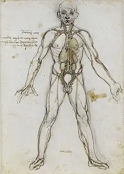 A anatomia tem servido às artes visuais desde os tempos da Grécia Antiga, quando o escultor Policleto do século V a.C. escreveu seu cânon sobre as proporções ideais do nu masculino.[113] No renascimento italiano, artistas como: Piero della Francesca (c. 1415–1492) em diante, incluindo Leonardo da Vinci (1452–1519) e seu colaborador Luca Pacioli (c. 1447–1517), aprenderam e escreveram sobre as regras da arte, incluindo a perspectiva visual e as proporções do corpo humano.[114]
