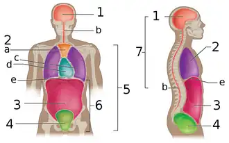 Na maioria das vezes os órgãos estão localizados em cavidades internas,[60] com exceção da pele que é considerada a maior estrutura do organismo,[63] e as cavidades são subdividas em dorsal e ventral, dentro destas estão localizados os órgãos internos. Para fins de pesquisa e localizações mais exatas, as cavidades dorsal e ventral são também subdivididas: a dorsal em cavidade craniana (onde está localizado o cérebro) e canal vertebral (no qual passa a medula espinhal, que é o prolongamento do sistema nervoso central); a ventral em: cavidade torácica (localidade em que o coração e pulmões, as partes torácicas dos grandes vasos e outras estruturas importantes estão), e a abdominopélvica que é dividida em cavidade abdominal (onde está o estômago, fígado, vesícula biliar, baço, pâncreas, intestino delgado e grosso, glândulas suprarrenais e rins) e pélvica (região em que se situam os órgãos reprodutivos e também o reto, bexiga e uretra).[64][65][66]