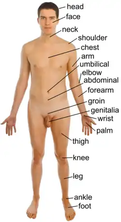 Na anatomia básica é formado pela cabeça, pescoço, tronco (que incluem o tórax e abdômen), braços e mãos, pernas e pés.[1]