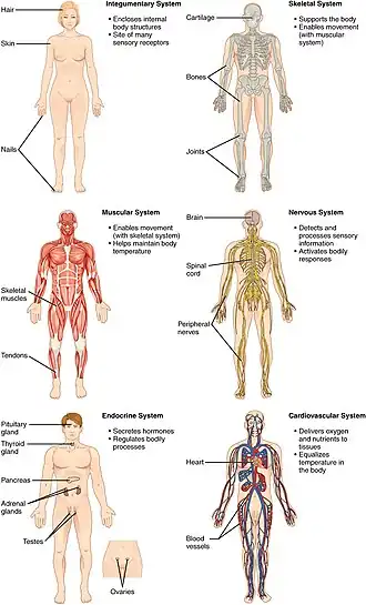 Os órgãos do corpo estão associadas frequentemente em sistemas, os quais são a reunião de estruturas que cooperam entre si para realizar funções complexas e consideráveis dentro do organismo. Existem vários sistemas que são necessários para a sobrevivência da espécie,[78] cada um tendo funções diferentes, e portanto, papéis exclusivos para desempenhar na fisiologia.[79] São eles: o circulatório (dividido em dois outros sistemas para fins de pesquisa: cardiovascular, responsável por transportar nutrientes e oxigênio para todas as células através do sangue e o linfático que recolhe as impurezas e conduz os glóbulos brancos e vários outros, através da linfa),[80] digestivo (onde acontece a transformação dos alimentos em nutrientes e, a eliminação do não necessário através das fezes), endócrino (faz a regulação e administração das funções do corpo através de glândulas, que produzem e liberam hormônios), imunológico (defende o organismo da invasão de patógenos), tegumentar (protege do mundo exterior, regula a temperatura corporal e é responsável pela sensibilidade), locomotor ou musculoesquelético (fornece a estrutura e locomoção, também é dividido em dois outros sistemas que são o muscular e esquelético),[81] nervoso (centro de controle do corpo, incumbido pela transmissão de sinais), reprodutor (garante a descendência da espécie através dos gametas, que posteriormente pós fertilização transformará em um embrião no útero), respiratório (traz oxigênio do ar para o organismo) e urinário (filtra o sangue e remove as toxinas e resíduos, transformando em urina).[82][83]