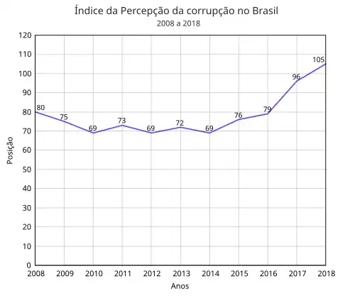 Em 2018, o Brasil ocupou o 105.º lugar entre 180 posições, com nota de 35 pontos de 100 pontos.[104] Atrás de países como Arábia Saudita, Burkina Faso, Sri Lanka, Ruanda e Timor-Leste empatando com Costa do Marfim, Egito, El Salvador, Peru, Armênia, Timor-Leste, Argélia e Zâmbia.[104] Este é o pior patamar de classificação, de 2012 até 2018 o país perdeu 8 pontos (um decréscimo de 18,6%) e caiu 36 posições, o que representa 52,17% se consider o lugar que ocupava em 2012; é abaixo da média global (43 pontos) e da média dos BRICS (37 pontos); dos 32 países da América, está em 20.º lugar, enquanto em 2012 estava em 12.º tendo sido ultrapassado por Jamaica, Suriname, Trinidad e Tobago, Argentina, Guiana, Colômbia e Panamá.[105]