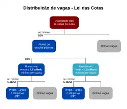 Em 29 de agosto de 2012, é sancionada a Lei nº 12.711, que define quotas reservadas para estudantes que tenham cursado integralmente o ensino médio em escolas públicas e oriundos de famílias com renda igual ou inferior a um e meio salário-mínimo assim como por pessoas autodeclaradas pretas, pardas e indígenas e por pessoas com deficiência no ingresso em cursos de gradução, constituindo, portanto um sistema de quotas misto que contempla questões sociais, econômicas e raciais.[35] Foi posteriormente regulamentada pelo Decreto nº 7.824, de 11 de outubro de 2012 que detalhou os critérios de seleção a serem aplicados para os cotistas.[36] Ambos instrumentos legais acabaram conhecidos como "Lei das Cotas".[37][38][39]