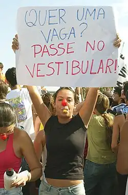 Nas universidades, a adoção de reserva de vagas começa em 2000, com a aprovação da lei estadual nº 3.524, de 28 de dezembro de 2000 no Estado do Rio de Janeiro. Esta lei garante a reserva de 50% das vagas, nas universidades estaduais do Rio de Janeiro, para estudantes das redes públicas municipal e estadual de ensino.[46] A lei estadual nº 3.708, de 9 de novembro de 2001, também do Rio de Janeiro, institui o sistema de quotas para estudantes denominados negros ou pardos, com percentual mínimo de 40% das vagas das universidades estaduais do Rio de Janeiro.[47]