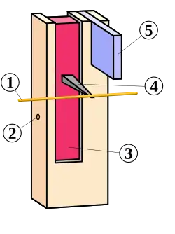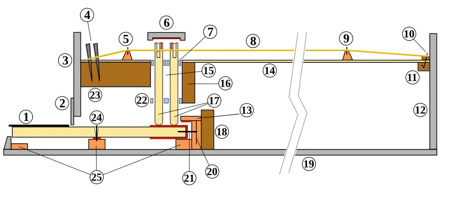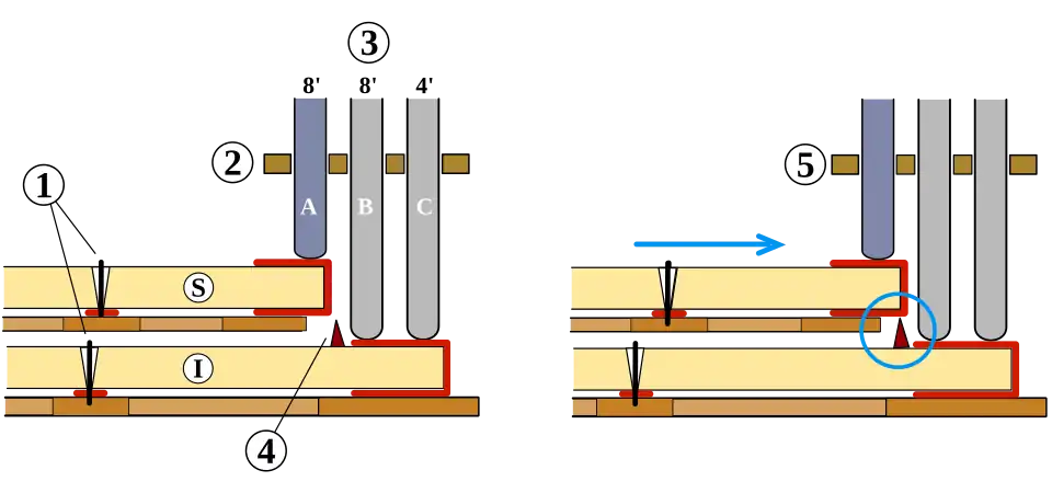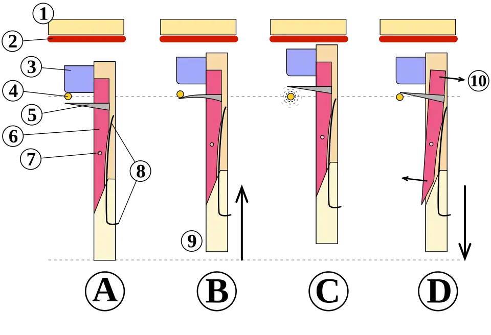 - Quando a tecla volta à sua posição de repouso, o saltador cai, descendo pela ação do próprio peso, e os pivôs do plectro se curvam para trás permitindo que ele passe pela corda (4) sem tocá-la. Isto se torna possível porque o plectro está fixado a uma lingüeta que, por sua vez, está presa por uma articulação e uma mola ao corpo do saltador.