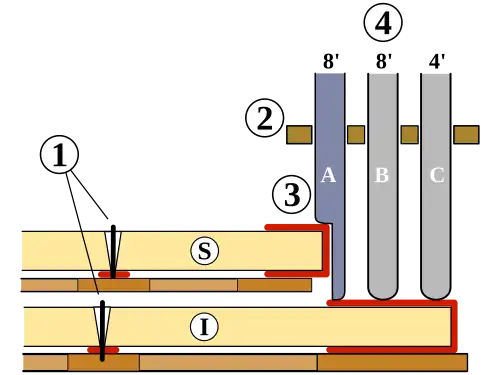 - O Saltador é uma peça de madeira, fina, retangular que se assenta sobre a extremidade final da tecla. É mantido no lugar por duas guias (superior e inferior) que são duas longas peças de madeira com furos através dos quais os saltadores possam passar.