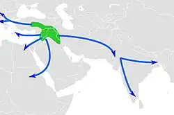 Estudos sugerem ainda uma difusão desta população diversificada para além do Crescente Fértil, com os primeiros migrantes a deslocarem-se do Médio Oriente — para oeste, em direção à Europa e ao Norte de África, para norte, em direção à Crimeia, e para nordeste, em direção à Mongólia.[19] Levaram consigo as suas práticas agrícolas e miscigenaram-se com os caçadores-coletores com quem entraram posteriormente em contacto, perpetuando as suas práticas agrícolas. Isto apoia estudos genéticos[25][26][27][28][29] e arqueológicos[19][30][31][32] anteriores, que chegaram todos à mesma conclusão.