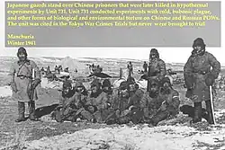 De acordo com a GlobalSecurity.org,[26] apenas os experimentos realizados pela Unidade 731 provocaram 3.000 mortes.[27] Além disto, "dezenas de milhares, e talvez cerca de 200.000 chineses, morreram de peste bubônica, cólera, antraz e outras moléstias…", resultantes do emprego da guerra biológica.