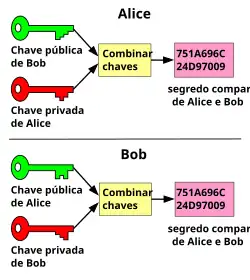 Em um sistema de chave assimétrica, Alice e Bob têm cadeados separados. Primeiro, Alice pede a Bob para enviar o cadeado dele aberto através do correio normal, mas mantendo com ele a posse da chave. Quando Alice recebe o cadeado, usa-o para trancar a caixa contendo a mensagem dela, e manda a caixa trancada para Bob. Bob pode então destrancar a caixa com sua chave e ler a mensagem de Alice. Para responder, Bob deve fazer o mesmo, isto é, pegar o cadeado aberto de Alice e trancar a caixa antes de enviar de volta para ela.