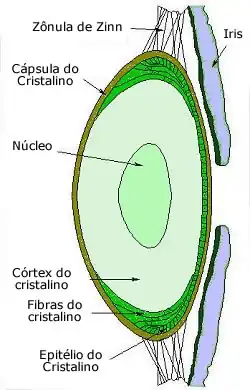 É constituído por células organizadas longitudinalmente, como uma casca de cebola, que perdem as suas organelas durante a formação, assumindo desta maneira sua característica de ser transparente. Tem de 7 a 9 mm de comprimento no seu maior eixo e 2 a 4 mm de espessura. O cristalino é formado, basicamente, por três partes:
