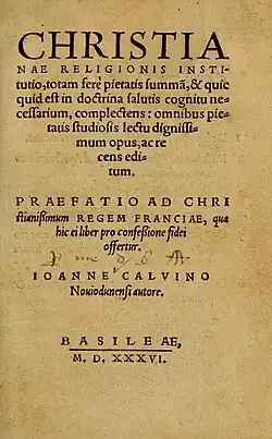 As Institutas da Religião Cristã, opus magnum (ou grande obra), foram publicadas pela primeira vez em 1536, e atualizadas com novas informações e ideias ao longo de 23 anos, sendo a sua última edição publicada em 1559.[14] Em sua primeira edição, foi publicada com o propósito de ser uma introdução simples (até mesmo rudimentar) ao conhecimento da vida cristã, ou, como dito pelo próprio Calvino:
