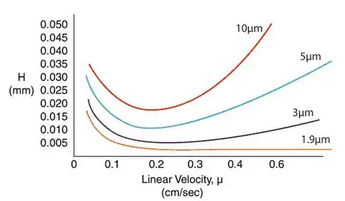 O tamanho da partícula tem relação direta com a eficiência da coluna na CLAE. Quanto menores as partículas do recheio da coluna, maior a pressão da coluna no sistema. Da mesma forma, quanto menores as partículas do recheio da coluna, mais finos serão os picos e melhor será a separação. A figura apresentada a seguir demonstra a relação do tamanho da partícula utilizada no recheio da coluna com a eficiência cromatográfica (H – altura equivalente do prato teórico) (LAKE, 2015). A figura relaciona H com a velocidade linear do fluxo cromatográfico em diferentes diâmetros de partícula, havendo menor dependência de H vs u para partículas menores.