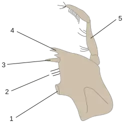 Os apêndices dos Crustáceos são tipicamente birremes.[3] Estes são compostos de um protopodito basal do qual podem derivar enditos no lado interno e exitos no lado externo (laterais) além de dois ramos chamados endopoditos e exopodito.[1]