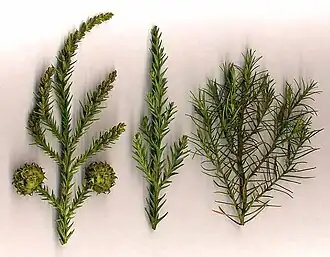 O ramos são verticilados, ascendentes nas pontas. As folhas são lineares, semelhantes a agulhas, inseridas em espiral, verde-azuladas, com 0,5-1,0 cm de comprimento.
