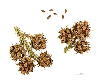 O fruto é um estróbilo globular, com 1–2 cm de diâmetro e cerca de 20–40 escamas, que se abre quando seca, libertando numerosas sementes aguçadas.