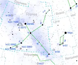- ↑ «Cygnus, Constellation Boundary». The Constellations. Consultado em 9 de dezembro de 2013