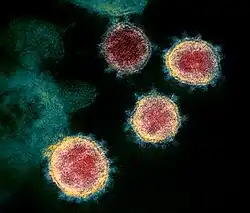 - Uma imagem do SARS-CoV-2, um vírus que causou a pandemia de COVID-19; a COVID-19 tornou-se uma pandemia global em 2020 e foi considerada uma emergência de saúde pública internacional até 2023.