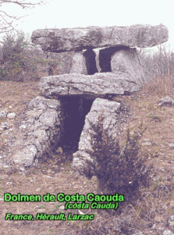 | “ | Em França, o termo designa um monumento pré-histórico construído, geralmente constituído de grandes lajes brutas, incluídas na origem num tumulus, e formado por uma câmara sepulcral provida de um acesso arquitectado, suposta ter recebido várias inumações[18]. | ” |