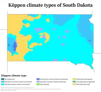 O clima de Dakota do Sul é temperado. Devido ao seu terreno pouco acidentado e distante de grandes massas de água, a Dakota do Sul possui grandes variações de temperatura e um clima instável, embora não tanto quando a instabilidade do clima de Dakota do Norte. Os invernos de Dakota do Norte são frios, enquanto que verões são muito quentes.