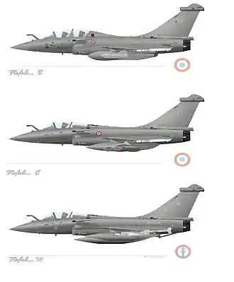 - Rafale M : Esta é a versão Aeronaval, que entrou em serviço em 2002. O Rafale M pesa cerca de 500 kg (lb 1.100) a mais do que o Rafale C. Muito semelhante ao Rafale C na aparência, o M difere nos seguintes aspectos: