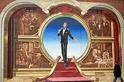 O Rat Pack era lendário por suas apresentações na Las Vegas Strip.[58] Por exemplo, a marquise do Sands Hotel pode dizer "DEAN MARTIN—TALVEZ FRANK—TALVEZ SAMMY".[a] Suas aparições eram valiosas porque a cidade ficava inundada de jogadores ricos. O ato deles (sempre de smoking) consistia em cada um cantando números individuais, duetos e trios, junto com palhaçadas e conversas aparentemente improvisadas. Na década de 1960, de forte carga social, suas piadas giravam em torno de temas adultos, como o caráter mulherengo de Sinatra e a bebedeira de Martin, além da raça e religião de Davis. Sinatra e Martin apoiaram o movimento pelos direitos civis e se recusaram a se apresentar em clubes que não aceitassem artistas negros americanos ou judeus.[61] Postumamente, o Rat Pack passou por um renascimento popular, inspirando a trilogia Ocean's de George Clooney e Brad Pitt.[62]